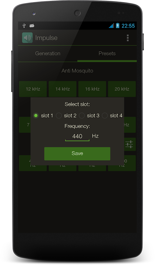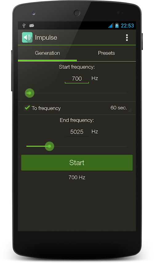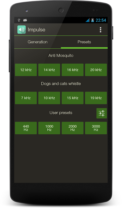 Easy to use audio signal generator (frequency generator) that generates audio tones from 1 to 22000 Hz.