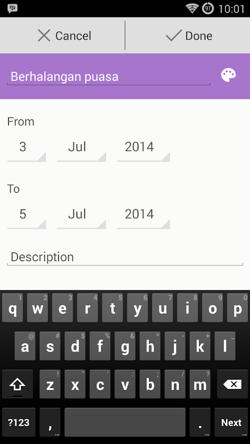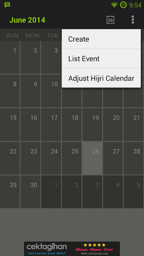 - Menambahkan event (menambahkan memo pada kalender, contoh : berhalangan puasa)