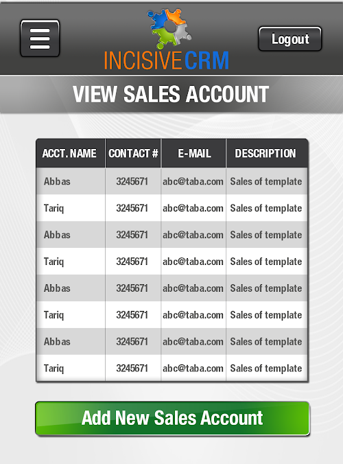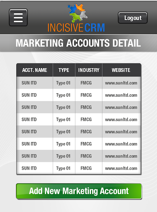 In this screen, list of all the available sales accounts,contacts & leads can be viewed providing the account name, and other details.