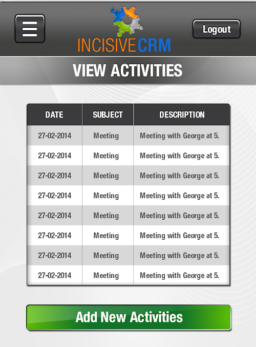 In this screen, a list of scheduled activities and meetings can be viewed along with the date and time they are scheduled on.