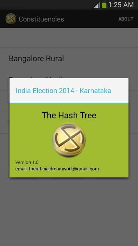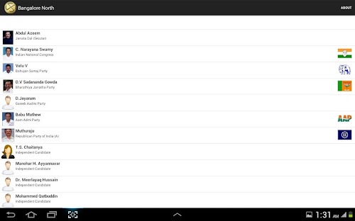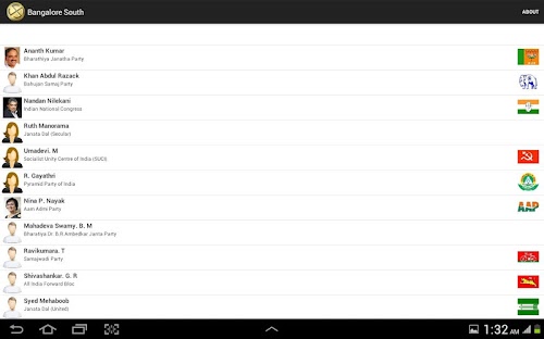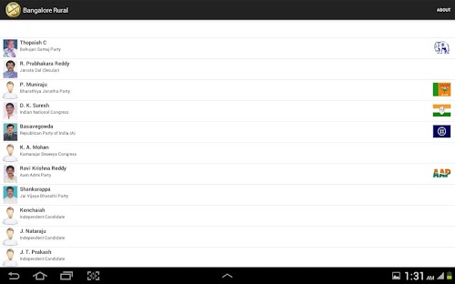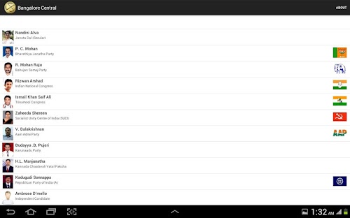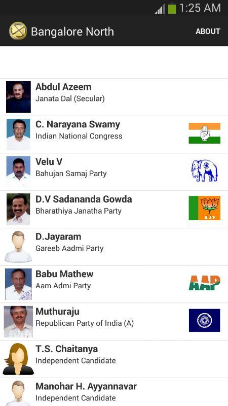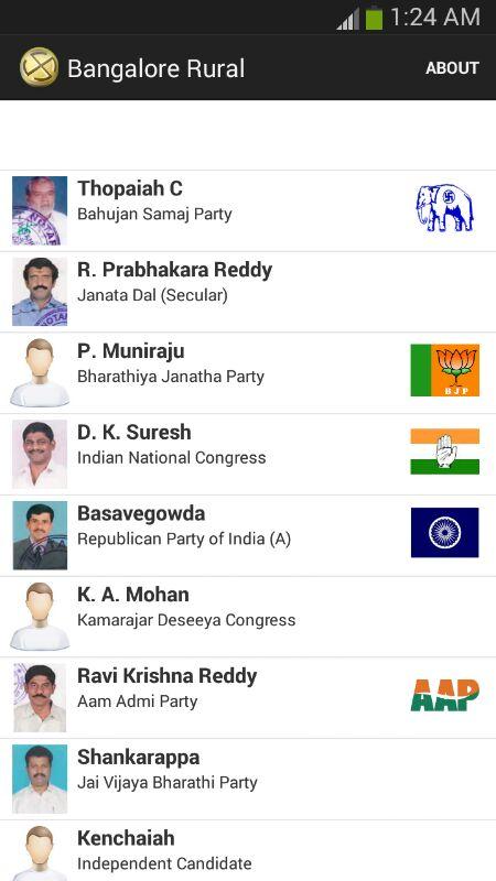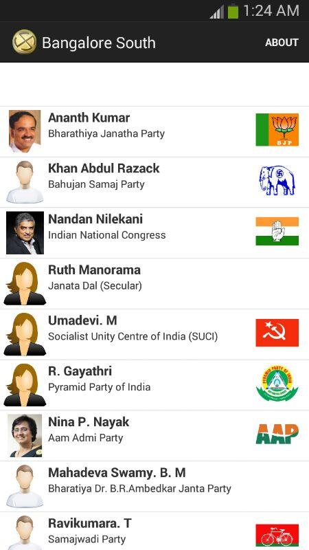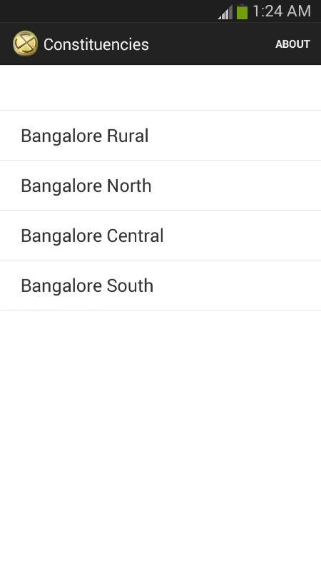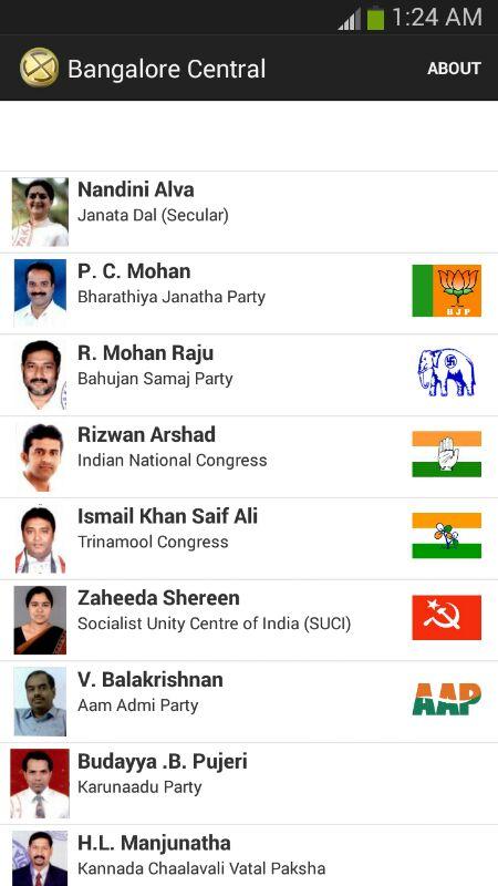 India Election 2014 - Karnataka app gives you details of all the candidates contesting the Indian General Elections 2014 from Bangalore South, Bangalore North, Bangalore Central and Bangalore Rural constituencies of Karnataka.
