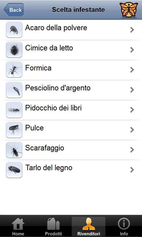 Starting from the selection of the type of environment (inhabited indoors, non-inhabited indoors, outdoors) the type of pest can then be selected which leads to a list of recommended products and tips on how to apply them.
