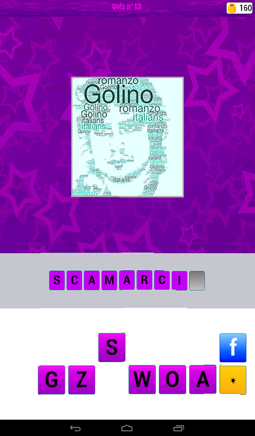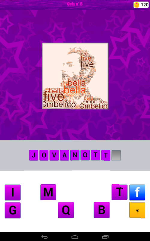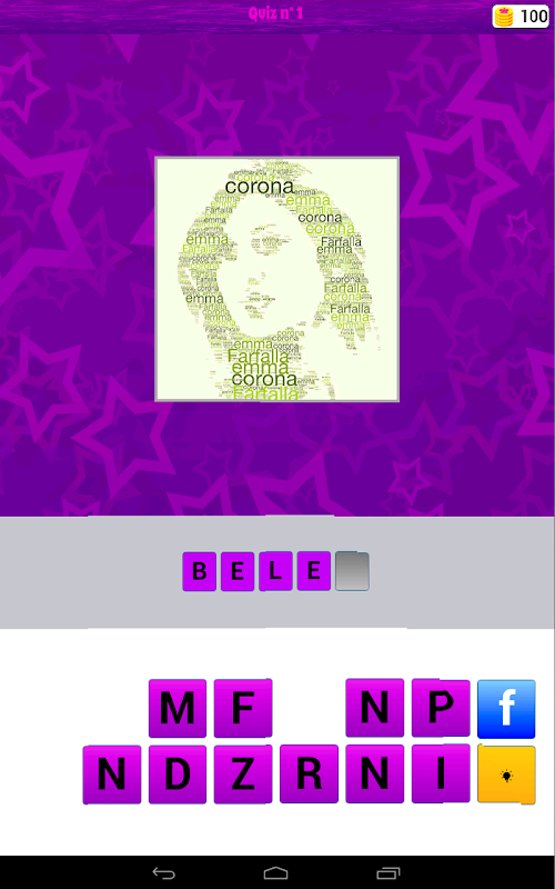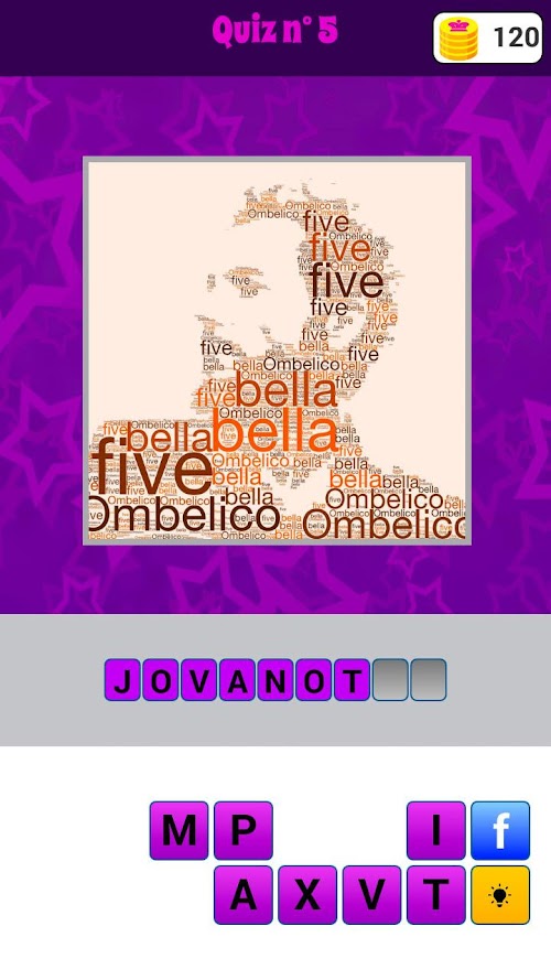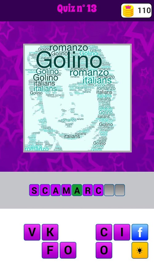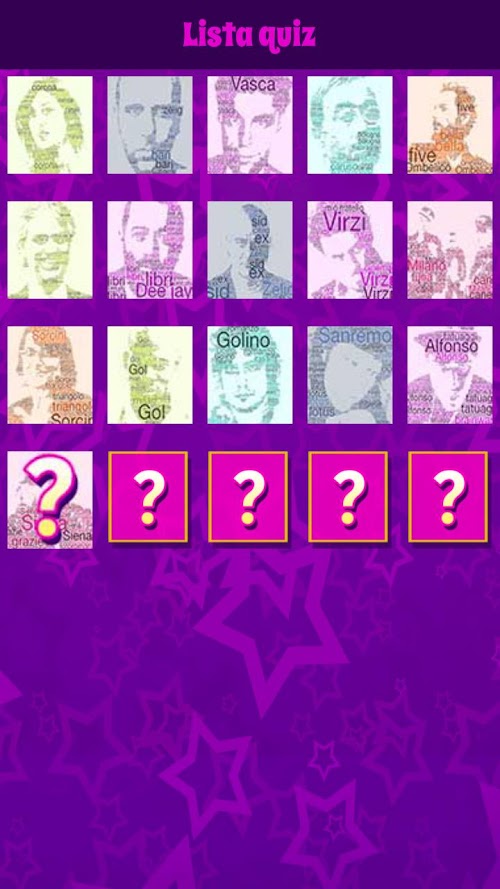 Se sei stato così abile da completare il gioco, non adagiarti sugli allori: sono in arrivo centinaia di altri personaggi da indovinare, sempre più divertenti e complicati. Aggiorna sempre la tua app e rimani informato seguendo la pagina su Facebook. Finally the quiz dedicated exclusively to VIP Italian: many actors, singers, groups, sports, showgirl and presenters that you will recognize in the images from time to time you will be shown. In your help'll find three different indications: three words that will help you identify the celebrity hidden.