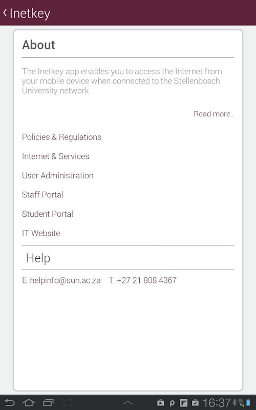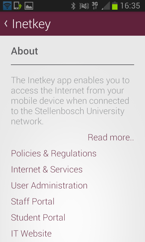 The Inetkey app enables you to access the Internet from your mobile device when connected to the Stellenbosch University network. This app is officially supported and endorsed by Stellenbosch University.