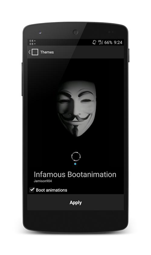 Only the boot animation from my themes. Official Infamous boot animation. Love the animation but like to switch it up and try other themes. Now you can keep Infamous' awesome boot animation while trying other themes.