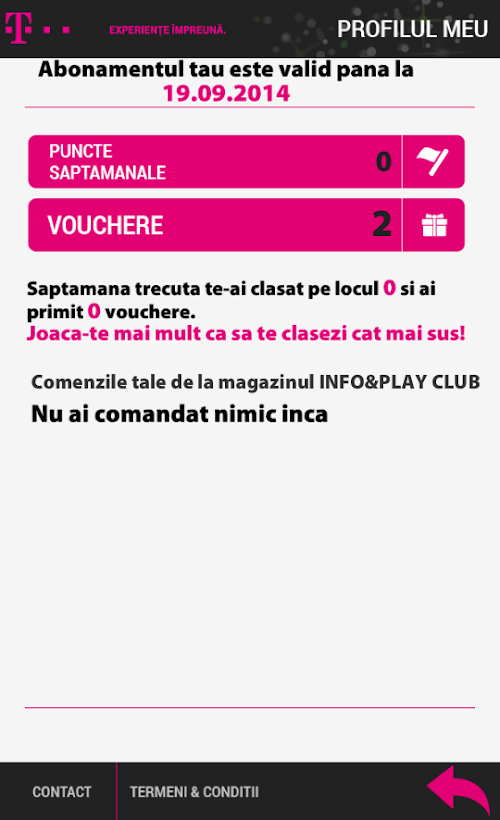 Pentru mai multe detalii despre serviciile Info&Play Club intra pe site-ul Telekom Romania.Subscribe to Services Info & Play Club, play in application Info & Play Club, accumulate points and turn them into vouchers!