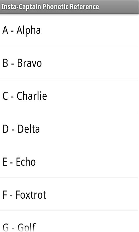 The Insta-Captain Phonetic and Morse Code reference application is a native Android application from the Insta-Captain brand for mariners. This is a simplified application that contains a reference to the Phonetic Alphabet as well as a full reference to Morse code. The Morse code section is in the international format using Di - Dah for use with sound or light signalling techniques. It includes the A-Z, 0-9, several European characters such as Ä, È, Ö, Ü and punctuation.