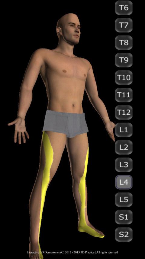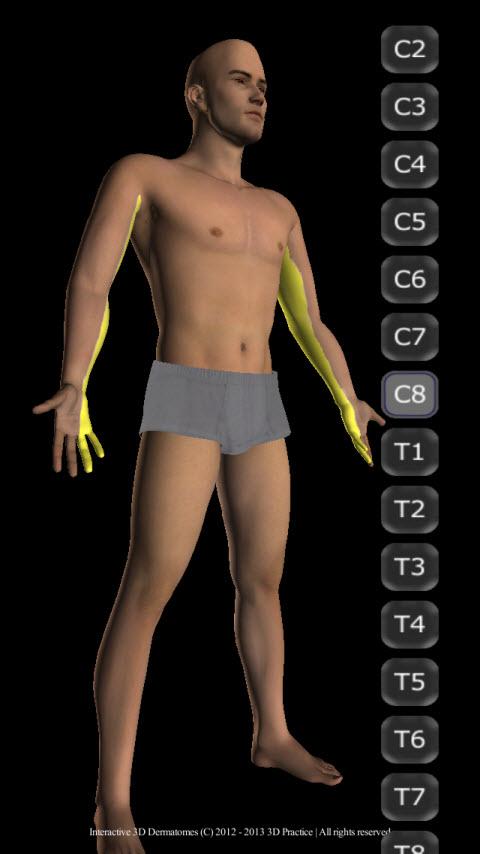 Interactive 3D Model supporting touch interface like pinch to zoom and swipe to rotate. Easily select a vertebra from scrollable buttons. Designed to fit and function well on Android smartphones.This is the way the dermatomes should be presented.