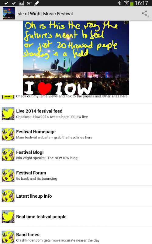 Hot link to the festival forum from your mobile/tablet. Check a separate twitter list from IOW people. Jump straight to google web news on the festival. Festival shopping. Festival weather forecast -well ten days ahead but eventually its useful. Bus and Ferry links - you can get to the festival by bus or inflatable. Check the IOW radio site on the internet.