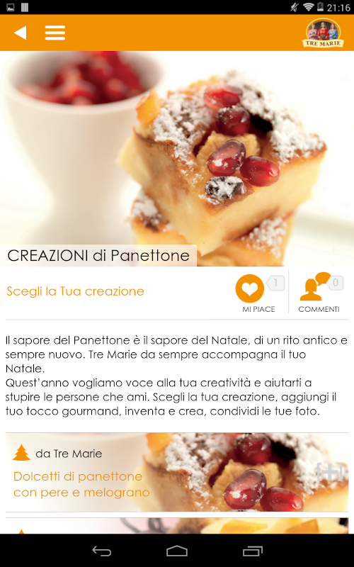 iPanettone è per chi ama il Natale. Per chi desidera rendere l’attesa verso la Vigilia ancora più coinvolgente e magica. Lasciati accompagnare dalle funzionalità iPanettone, lasciati sorprendere e scegli di sorprendere per questo Natale scoprendo ogni giorno una casellina, condividi il tuo Natale.Make your magical Christmas 2013 iPanettone, the Advent Calendar signed by Tre Marie, full of surprises to discover every day: recipes and creations to impress, small gifts, last minute, decor ideas, stories, ideas to pamper your family and ... many other gifts for you.