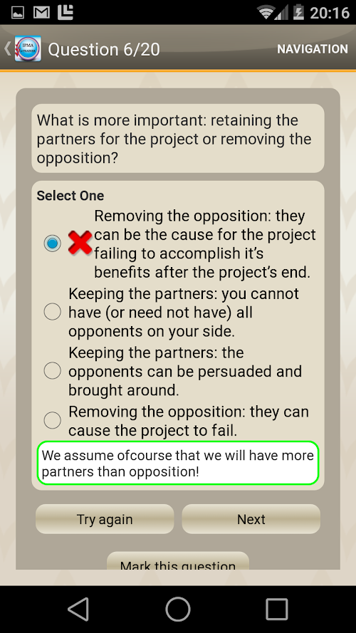Studying for the exam IPMA D-level? This App will help you build your knowledge and understanding of IPMA-D examination and will strongly help you in passing your IPMA D-level on your first try! Thousands of students have taken benefit from our approach to IPMA D-level training. One stop shopping gives you all our test questions within easy reach in this App!