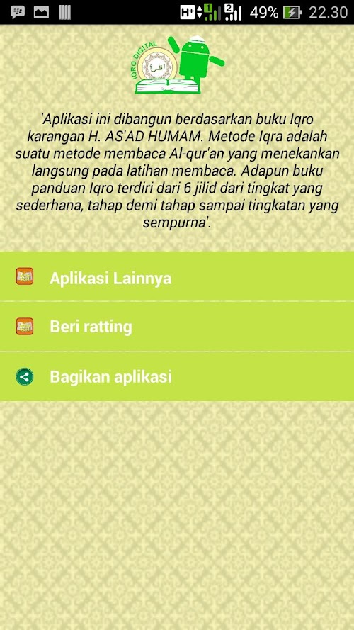 "bangga akan karya indonesia"Digital Iqro an application that is education or education in the field of Islamic religion to teach children about the basics in reading the Koran or Qur'an, Iqro is a direct method to practice reading. As for digital Iqro guide consists of 6 volumes of the level of simple, step by step to the perfect level.