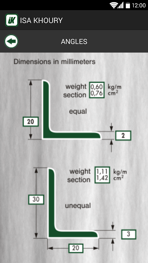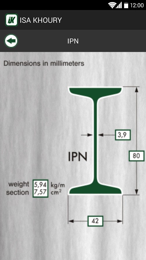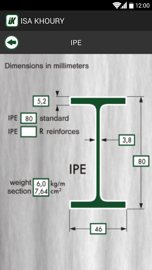 The ISA KHOURY Steel Sections App for Android shows the main dimensions, meter weights cross sections of series IPE, IPN, HEA, HEB, HEM, HEC, UAP and UPN steel beams. Angle iron, plate and steel bar as well as scales to calculate steel flats.