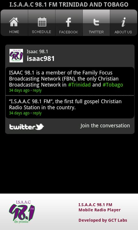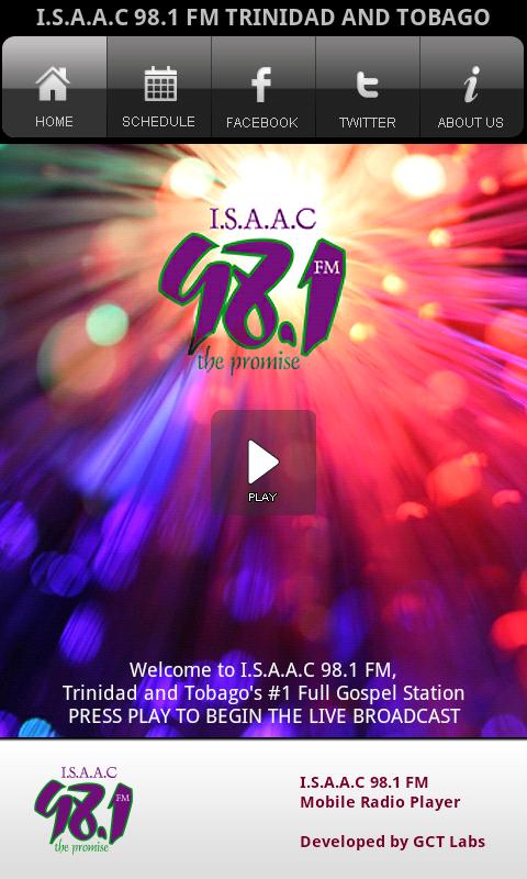 Tune in to I.S.A.A.C 98.1 FM, the first full gospel Christian Radio Station in the twin-island republic of Trinidad and Tobago. The Mobile Player gives you access to ISAAC 98.1's radio broadcast,as well as real-time updates on Facebook and Twitter.