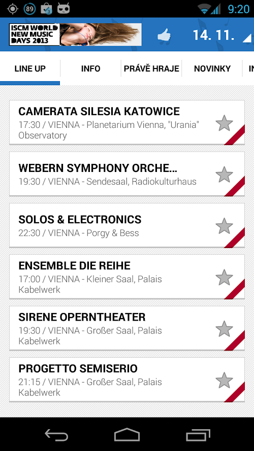 - Oblíbená vystoupení (aplikace upozorní 10 minut před vystoupením)