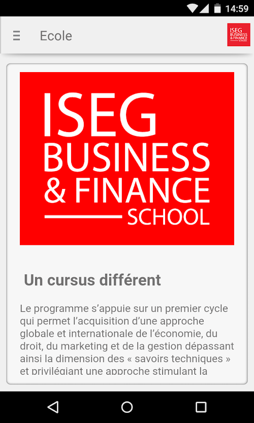 Cette application vous permet d'accéder aux informations et actualités de l'ISEG Business & Finance School.