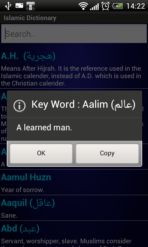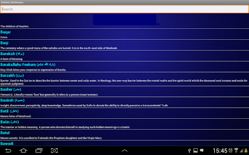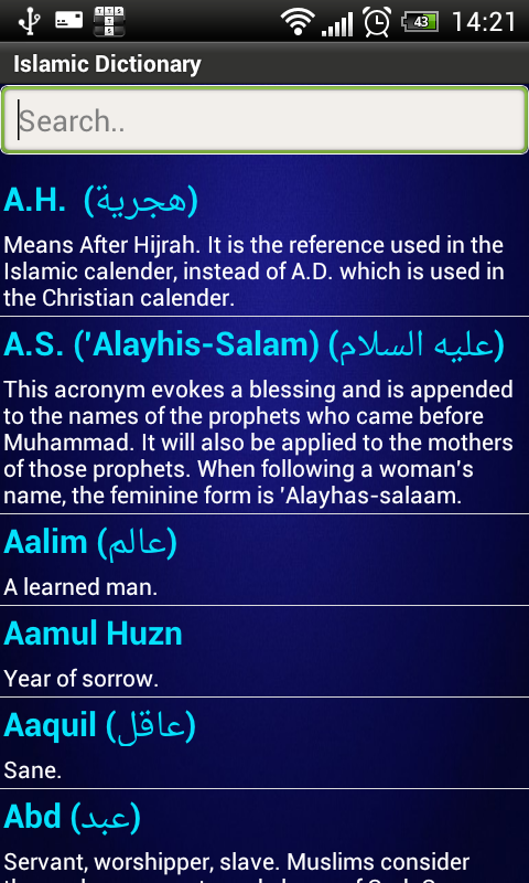 This application offers OFFLINE, FREE - easy and handy Islamic Mini Dictionary. Completely offline dictionary to find the meaning or definition for most Islamic terms. Keywords and meanings can be copied to your clipboard. Some of the terms have arabic text!.