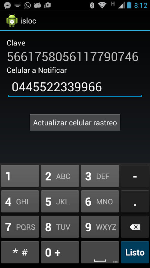 3. Especifica en la pantalla de configuración de isloc cual es el numero del teléfono B ( al que se enviara la ubicación de A)