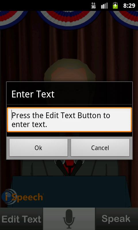 Type or speak any phrase and listen to it spoken out loud by iSpeech Bush™. The app’s human-quality text to speech (TTS) and speech recognition is powered by iSpeech®, a leading speech provider for mobile developers, and the creator of the award-winning application, DriveSafe.ly®. Learn more at www.iSpeech.org.