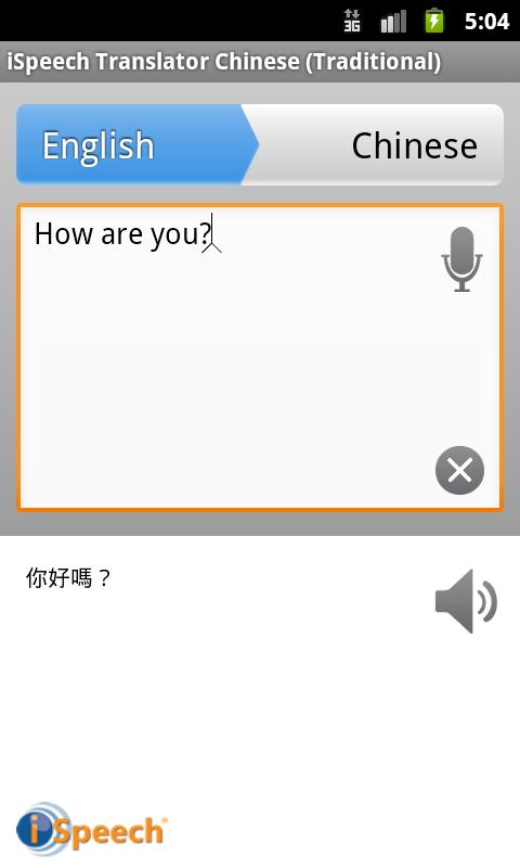 Speak and translate any words or phrases including email or text (SMS) in multiple languages (based on your mobile device's language setting) with iSpeech Translator™ Chinese (Traditional). The app’s human-quality text to speech and speech recognition are brought to you by iSpeech®, the creator of DriveSafe.ly®, award-winning leader in texting while driving applications.