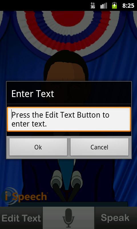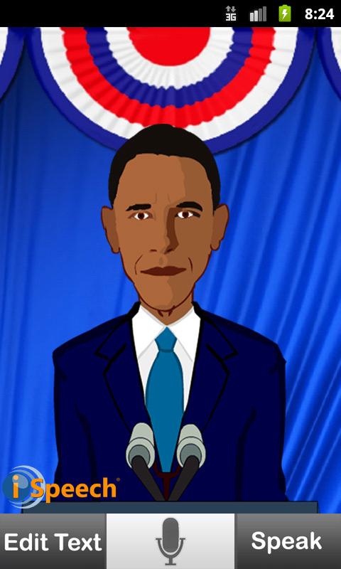 Type or speak any phrase and listen to it spoken out loud by iSpeech Obama™. The app’s human-quality text to speech (TTS) and speech recognition is powered by iSpeech®, a leading speech provider for mobile developers, and the creator of the award-winning application, DriveSafe.ly®. Learn more at www.iSpeech.org.