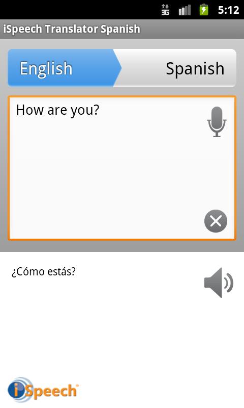 Speak and translate any words or phrases including email or text (SMS) in multiple languages (based on your mobile device's language setting) with iSpeech Translator™ Spanish. The app’s human-quality text to speech and speech recognition are brought to you by iSpeech®, the creator of DriveSafe.ly®, award-winning leader in texting while driving applications.
