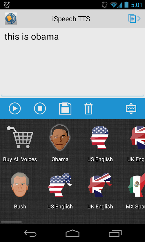 iSpeech lets anyone convert text-to-speech voices without the need to download TTS voices to your device. The entire app is under 3 MB (not including text to speech audio files you create by entering text).