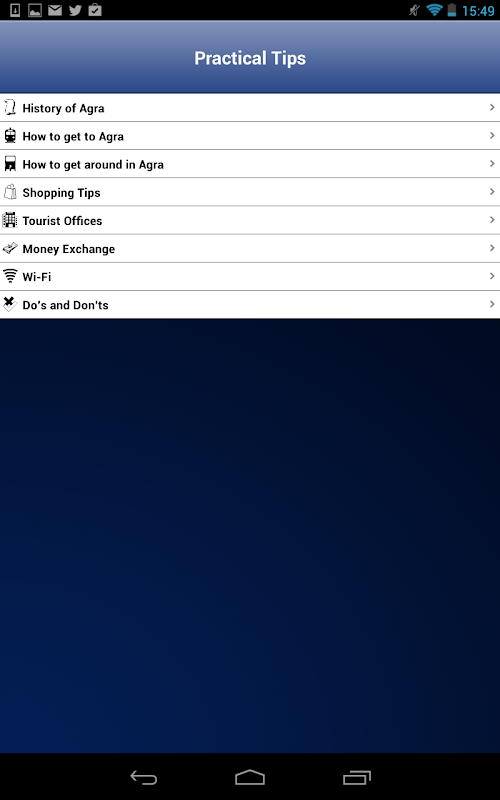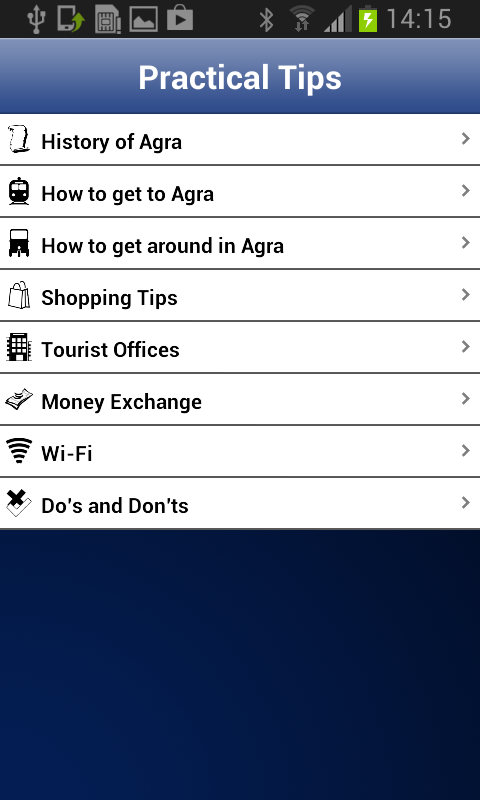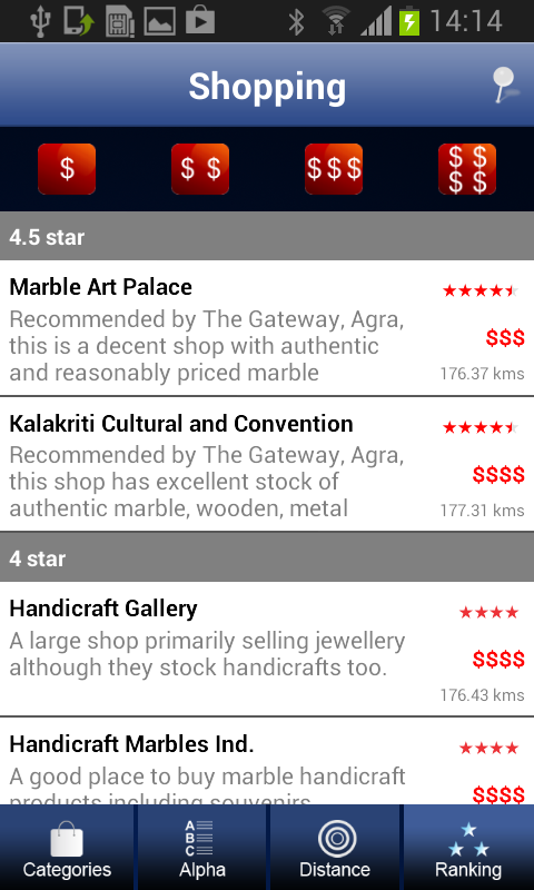 All the sights and shops worth visiting at Agra are listed with a rank, review, photos and practical information like opening times, ticket prices, website address, prohibited articles etc. The app uses GPS to give you the distance of sights from your current location, helping you navigate to the ones closest to you on the offline map.