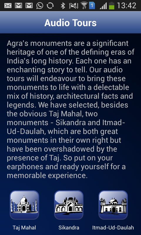 > Self-guided, interactive and well researched audio tours for Taj Mahal, Sikandra and Itmad-Ud-daula