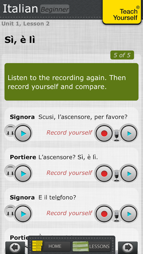 Learn to speak Italian like a native with Record & Compare – a Teach Yourself® tool that gives you instant access to how your pronunciation compares to a native speaker’s.