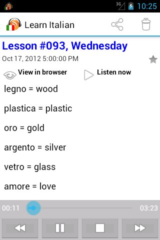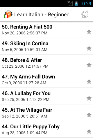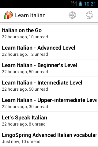 Italian Podcasts (Learn Italian with Podcasts) contains over 25 popular podcasts in Italian. Italian Podcasts brings to you thousands of lessons and listening hours to help you study Italian at all times. Whether you're looking for simple Italian survival phrases, lessons for newbies or advanced learners, grammar lessons, natural conversations, or Italian culture, you will be greatly benefited from the podcasts. This app will be especially useful not only for Italian learners but also for people who have interests in the Italian language and culture.