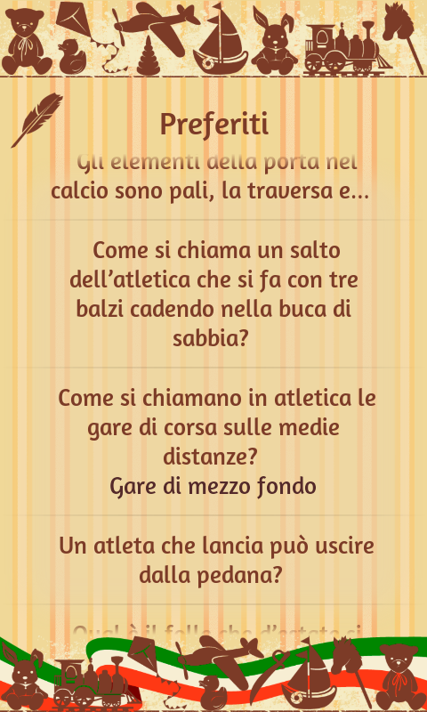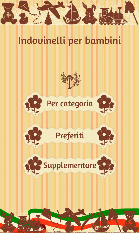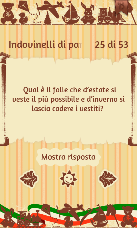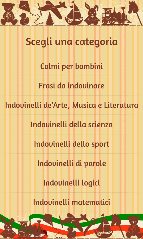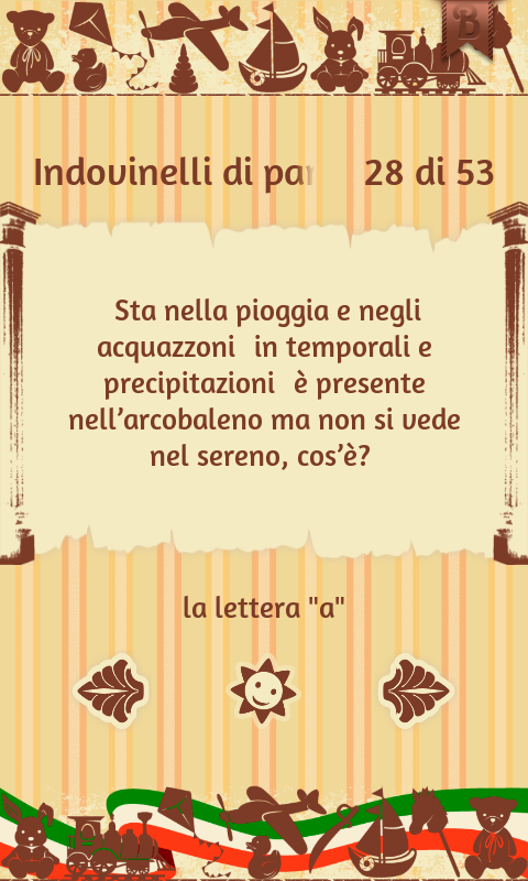Riddles in this application thoroughly reviewed and approved twice for suite high parental standards, sorted in 16 categories: "Rompicapi per bambini", "Indovinelli per giocare a Natale", "Indovinelli logici", "Indovinelli matematici", "Persone e mestieri", "Indovinelli vari per bambini", "Indovinelli sugli animali e piante", "Indovinelli sul cibo", "Indovinelli della scienza", "Frasi da indovinare", "Indovinelli su geografia", "Indovinelli su storia", "Indovinelli su oggetti", "Indovinelli sui mestieri", "Indovinelli de'Arte, Musica e Literatura" and "Indovinelli di parole".