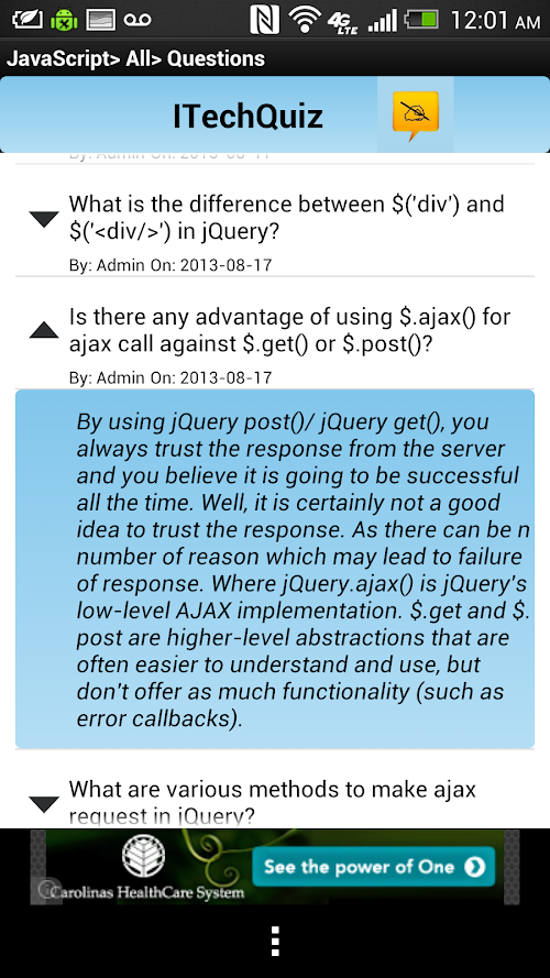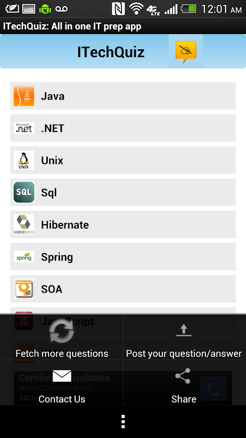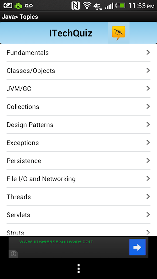 ITechQuiz is the most consolidated set of IT interview question and answers ranging from Java, J2EE, Servlets, JMS, Struts, UNIX, SQL, Spring, Hibernate, .NET, C# , WCF, WPF, ADO.NET/LINQ, ASP.NET, JavaScript, AJAX, jQuery, XML, Webservices(SOAP/REST). It is a must have on-the-go app for the IT crowd. One app for all your interview needs. Over 600+ questions/answers organized by topic. Ability to fetch latest questions from time to time. Share your own interview questions by posting them and receive notifications when new questions are added. More topics to be added soon.