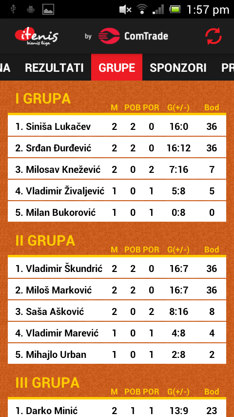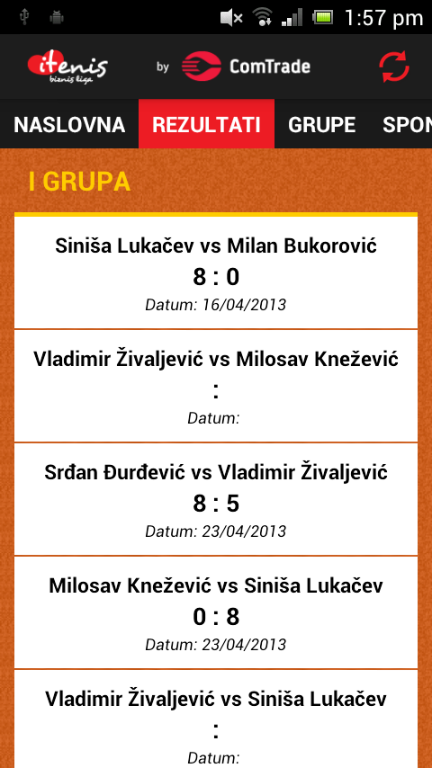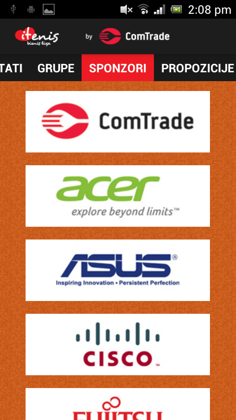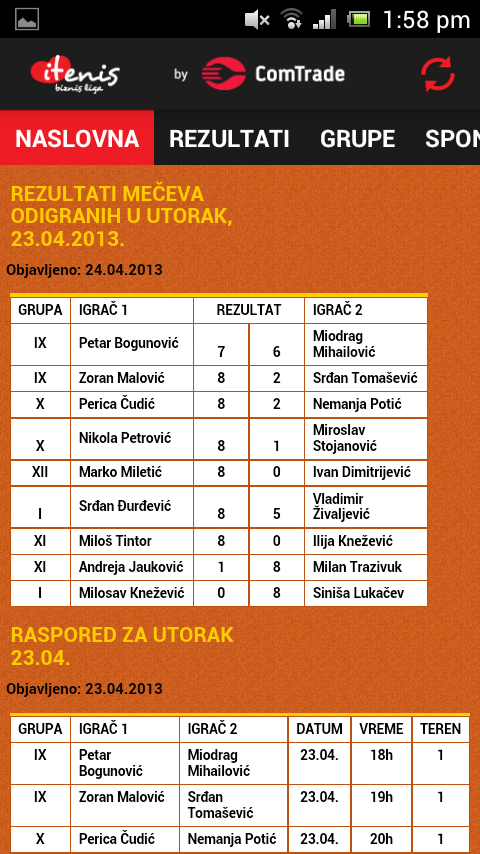 Kretanje između kategorija se obavlja povlačenjem prsta sa leve na desnu stranu ekrana (i obrnuto), ili klikom na slajder koji sadrži imena kategorija. Na početnoj stranici moguće je zumiranje (pomoću simbola „+“ i „-“ ili dvostrukim tapkanjem)Application "iTenis" is intended for participants' IT business tennis league "organized ComTrade. Now you can keep up to date with developments in the league in a simple and clear way, from any Android device.