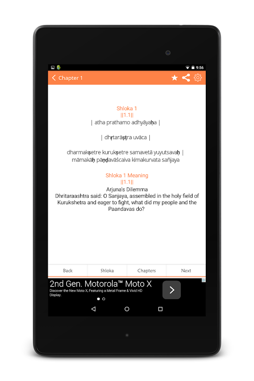 You can save your favorites shlokas, share them, and search them. Read the Gita shloka by shloka with its meaning or for recitation (parayan) we have included a scroll-able version without the meaning. It includes meanings in English, Hindi, German, Spanish, French, Chinese.