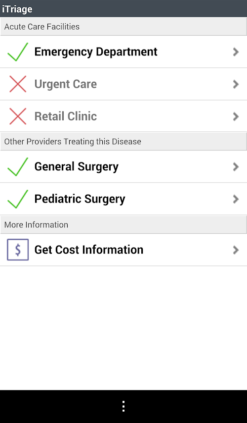 * Proprietary Symptom to Provider pathway: You can search health-related symptoms, learn about potential causes, and then iTriage Health will help you find the most appropriate treatment, health facility or doctor