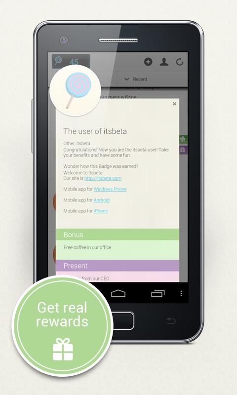 Itsbeta application gives you the opportunity to get rewards for activities in the real world. Take part in our partners events, blood donations, get achievements for academic activities and so on. All awards will be gathered in one convenient application and will be available at any time.