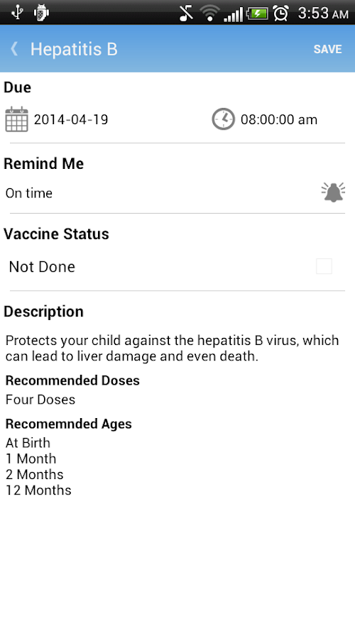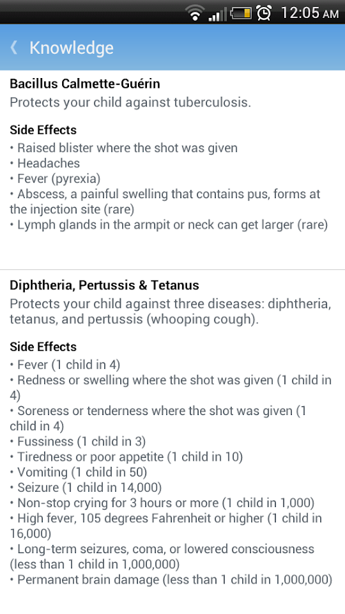Legal disclaimer: The content on this application is presented for informational purposes only. Never disregard professional medical advice from your child's paediatrician or health care provider or delay in seeking it because of something you have read on this application. This application offers vaccine information for informational purposes only. It is not the intention of this application to provide specific medical recommendation or professional advice. You should always consult with your child's paediatrician or health care provider before making any decisions regarding your child's immunization. You should not use this information to self-schedule vaccines for your child. Always use your child's paediatricians recommended schedule and use this application as an aid in remembering when you need to take your child in for a shot. You should never disregard professional medical advice or delay in seeking it because of something you have seen or read in this application. This application provides the information content on an 'as is' and 'as available' basis. No warranty is expressed or implied that this application is a comprehensive source of information on any topic of health or otherwise. In no event shall the creator of this application be liable in any manner for any direct, incidental, consequential, indirect or punitive damages arising out of your access, use or inability to use this application, or any errors or omissions in the information on this application. The creator of this application reserves the right at any time and from time to time to add, change, modify, update, or discontinue, temporarily or permanently, this application (or any part thereof) with or without notice. The creator of this application shall not be liable to you or to any third party for any addition, modification, suspension or discontinuation of this application.