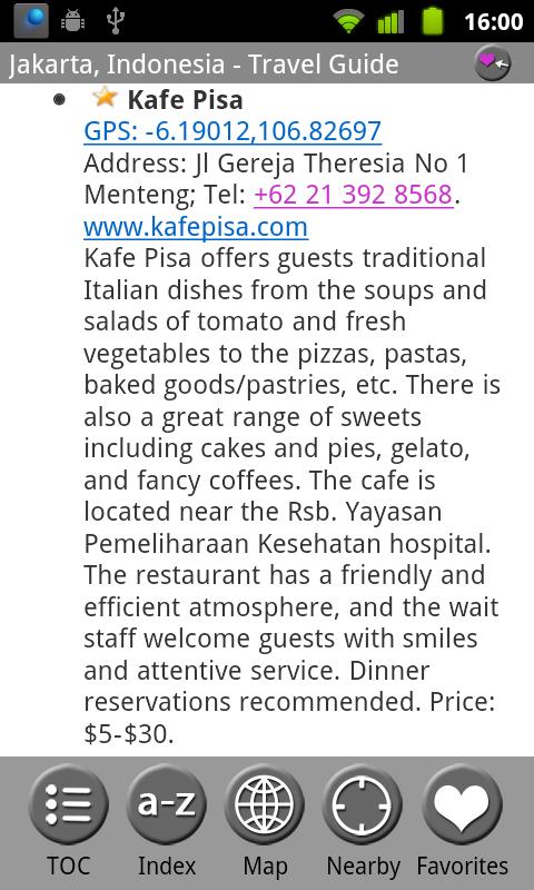 MobileReference Travel Guides provide detailed, practical information about attractions, landmarks, transportation, cultural venues, dining, lodging, history and much more. They are indexed alphabetically and by category, making it easier to access individual articles. Attractions can be viewed on an offline GPS map along with your current location so that you can easily find attractions near you as you explore the city.