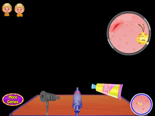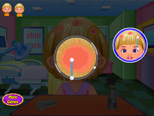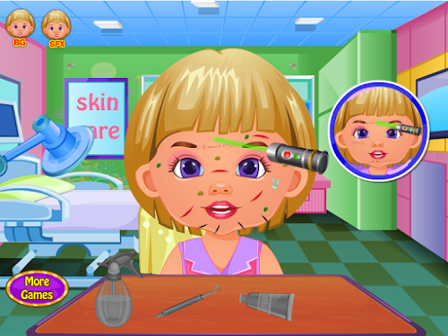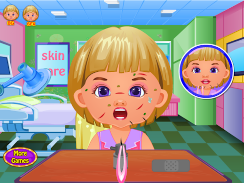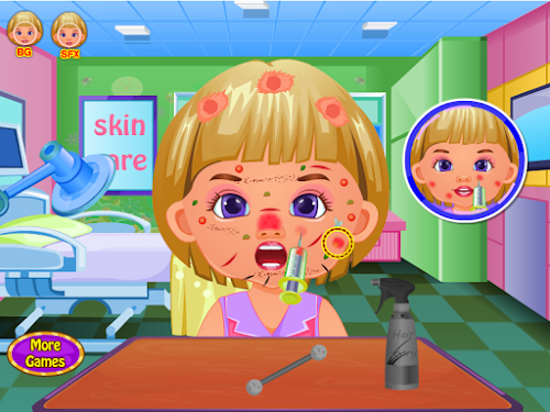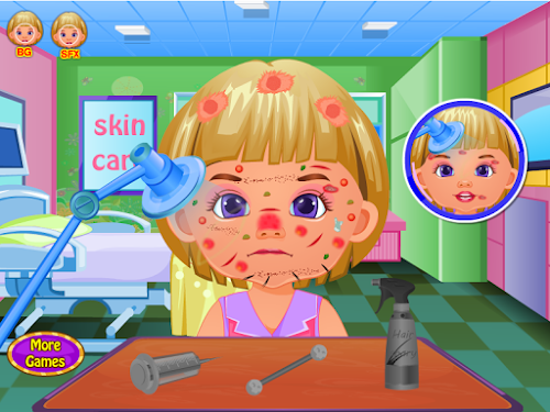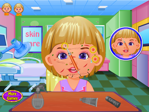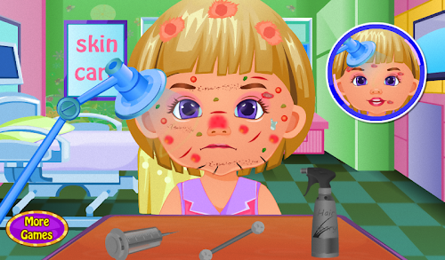 Hello, in this kids game you will meet a girl who comes to this skincare cabinet. You, as a doctor, must help the child to get rid of rashes, scratches and other skin disorders. For the result to be good you must follow certain steps: