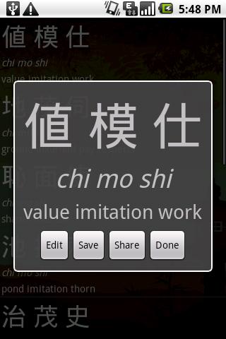 Features: combine different kanji to change the meaning, save your favorites, share via Twitter, email, SMS, etc.