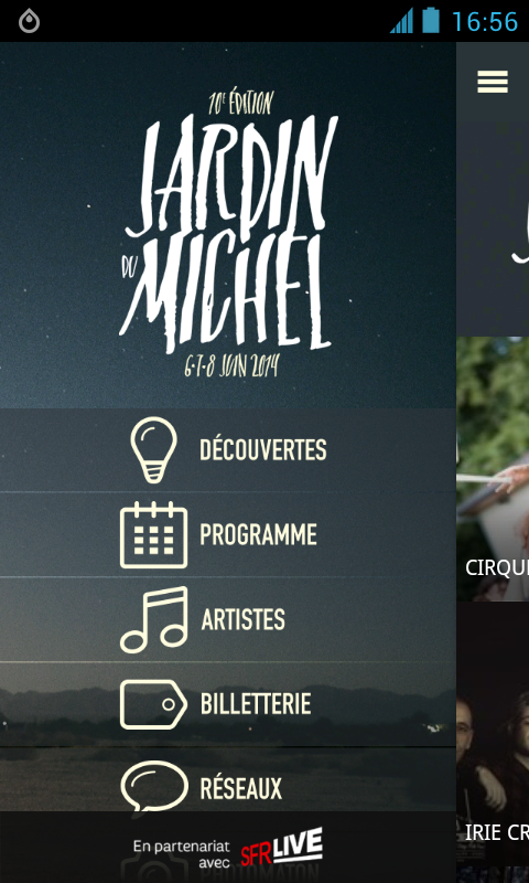 Entrez, c’est ouvert et ... bienvenue chez le Michel !This application offered by SFR Live Concerts invites you to take a ride on the side of the Jardin du Michel, whose 10th edition will be held on 6,7 and 8 June 2014 Bulligny (54).