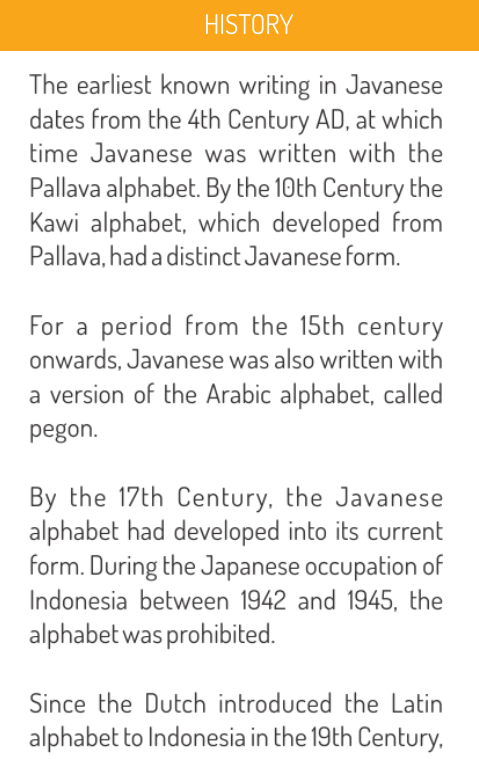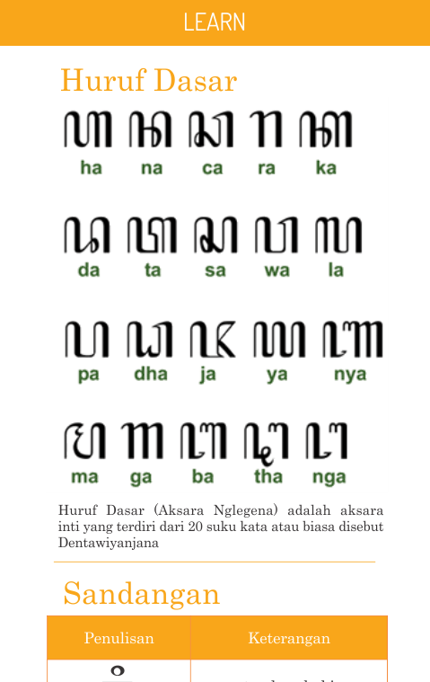 It provides "Learn" feature that explain about how to write Aksara Jawa and "History" feature that explain about it history.