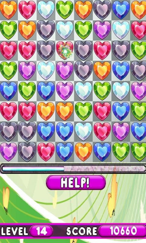 Tap the screen, swipe & match at least 3 of the gorgeous jewels heart gems, blast and smash through tons of levels filled with colorful heart gems!