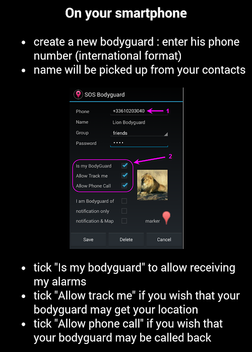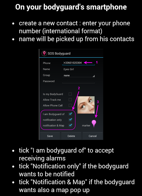 If YOU need a bodyguard, you pick his phone number into your contacts and declare it as a “Bodyguard”.