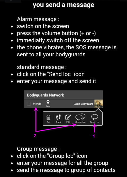 - can trigger an alarm to all your bodyguards, even when the phone is locked : Simply push volume button and immediately switch off the screen. Nothing more, can be done into your pocket (witch on, volume button, switch off)