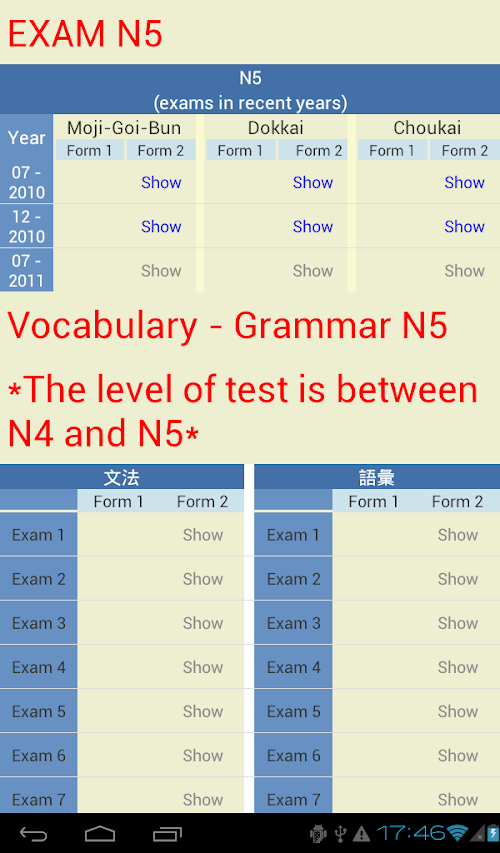 - N5 exams in recent years: with 9 tests, and 3 forms: Moji-Goi-Bun, Dokkai, and Choukai.