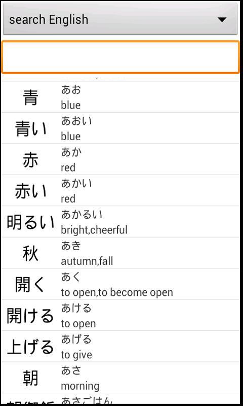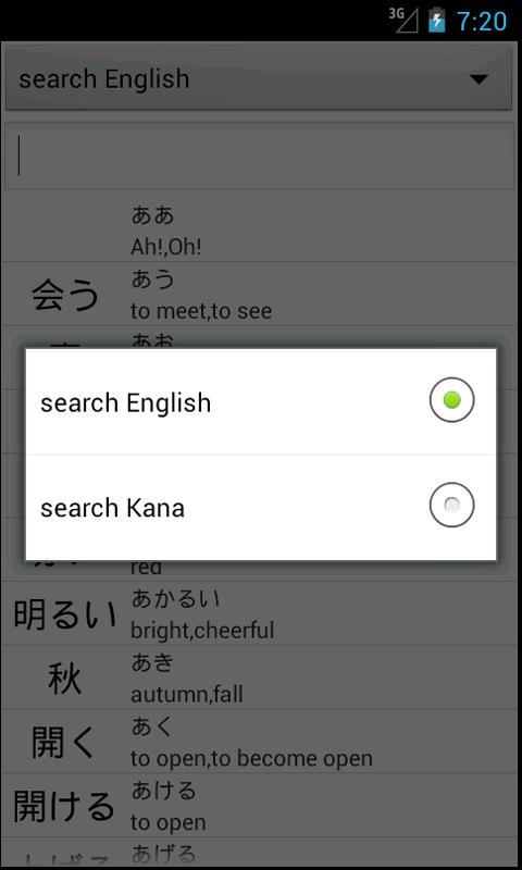 Browse and search the dictionary. There are more than 700 entries with a lot of additional vocabulary. Search criteria may be entered in english or in hiragana. Possibility to switch directly to the corresponding card.