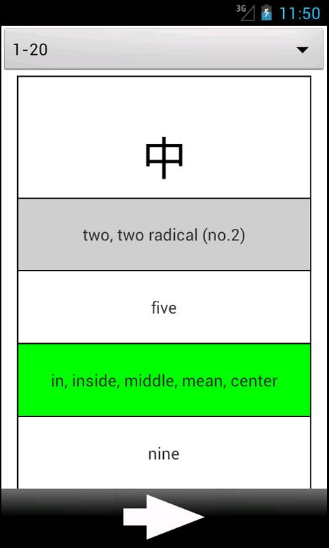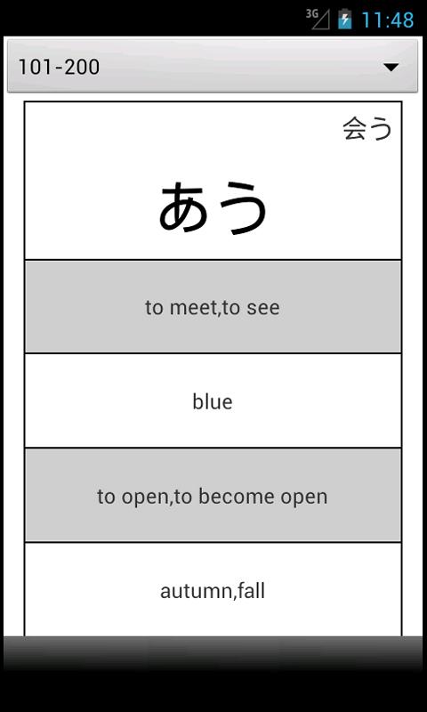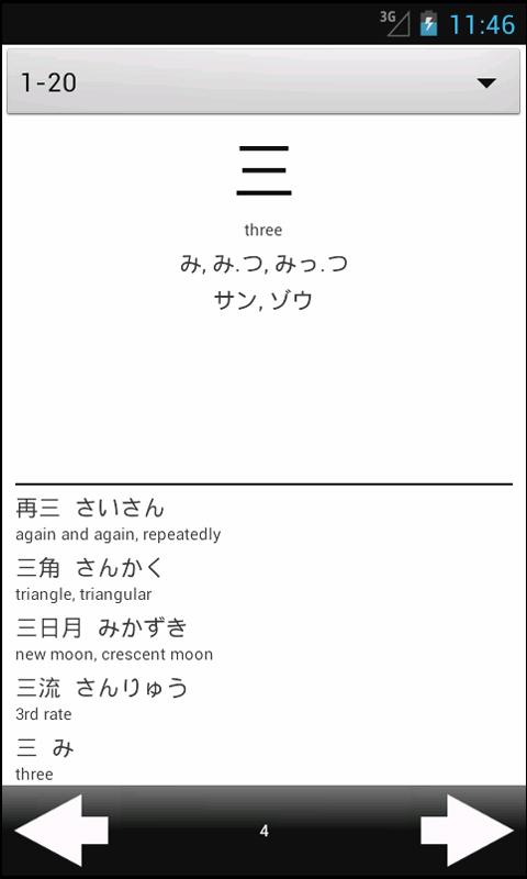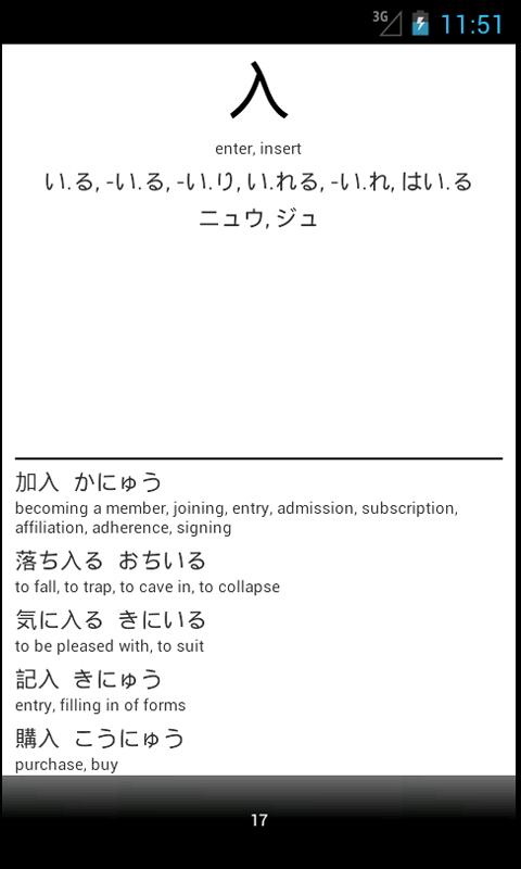This tool is ideal for learning. You can easily browse all entries with forward and back buttons. There are a lot of entries so we made different sets which enable you to study just a handful of words at a time. If you feel yourself safe on a set, you may proceed to the next one at any time. The cards for the Kanjis include readings in Hiragana and Katakana as well as a lot of compounds with additional vocabulary.