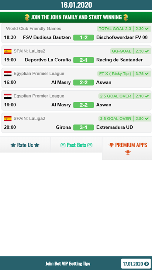 If you wish to have high odds, you can purchase one time our John VIP Betting Tips application and use it life time. John VIP Betting Tips application provides sure betting tips and wins always.